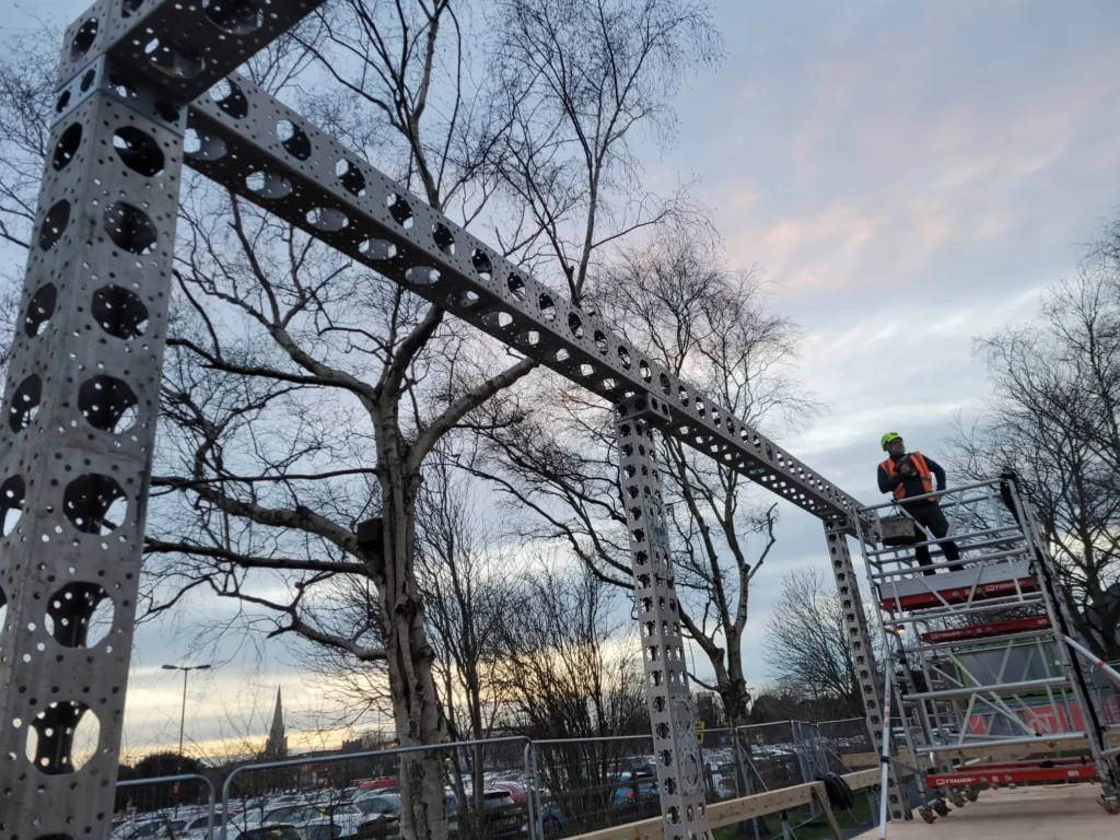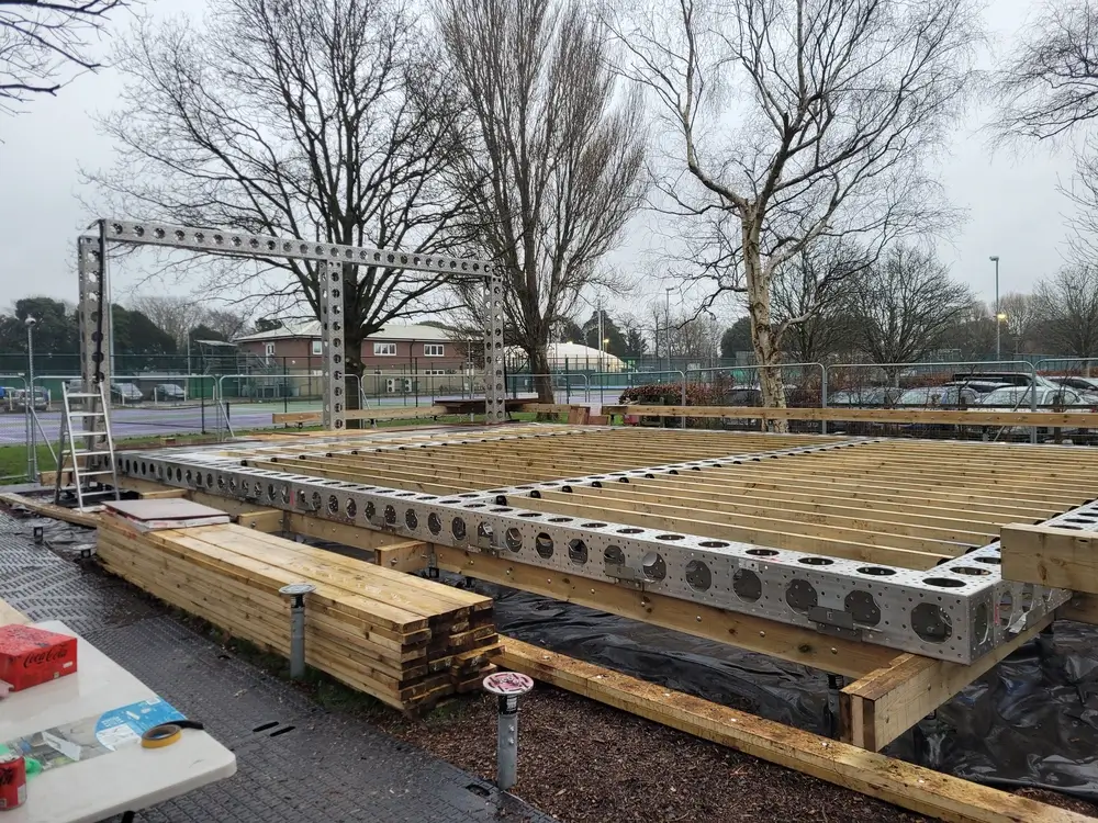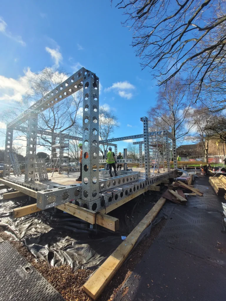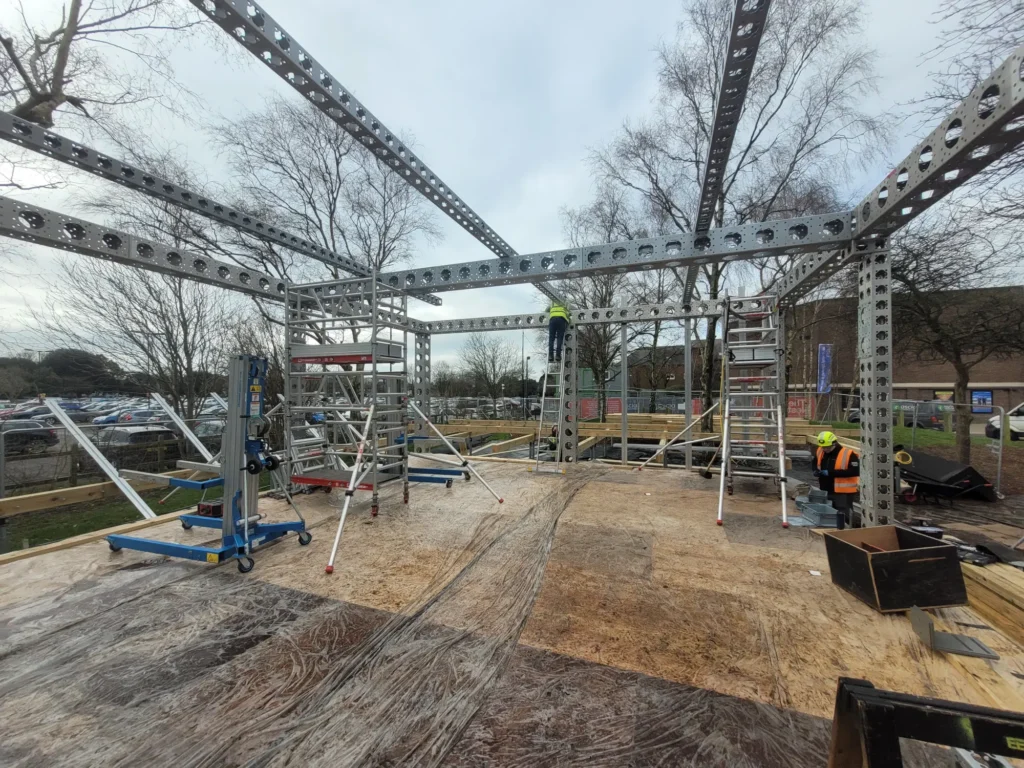 EEE Build was engaged to handle the complete onsite works for the base ModTruss structure — from logistics planning to final erection. Our background in modular construction and deep familiarity with the ModTruss system made us the natural fit to bring the reimagined venue to life. Working closely with Ascia Construction’s site team — particularly Neil Fail and Pete Russel — we coordinated installation in tandem with groundworks and the wider site programme. Over a focused 10-day build window, our 7- person crew reassembled the structure, integrating Reed Watts’ architectural upgrades and ensuring a precise, level, and safe installation.